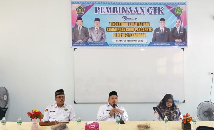 Pekanbaru — Kepala Kantor Wilayah Kementerian Agama Provinsi Riau, Dr. H. Muliardi, M.Pd dan Kepala Kemenag Kota Pekanbaru, Drs. H. Syahrul Mauludi, MA melakukan pembinaan Guru dan Tenaga Kependidikan (GTK) MTsN 2 Pekanbaru dengan tema “Tingkatkan Kualitas dan Kemampuan Guru PascaPHTC” pada Senin, 9 Februari 2026. Kegiatan ini diikuti oleh seluruh guru dan staf madrasah.
